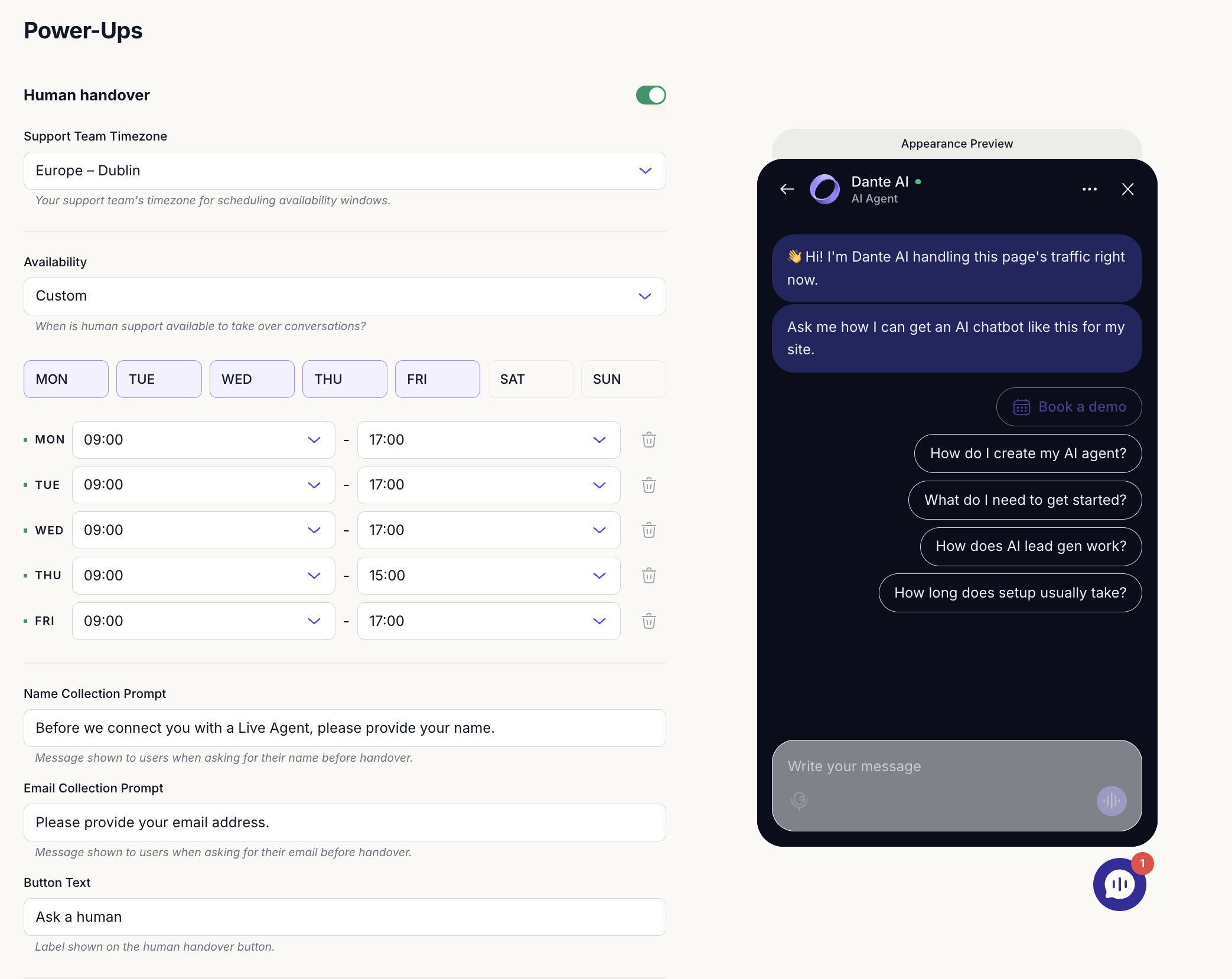 - Enable Human Hand Off at chosen points in the conversation