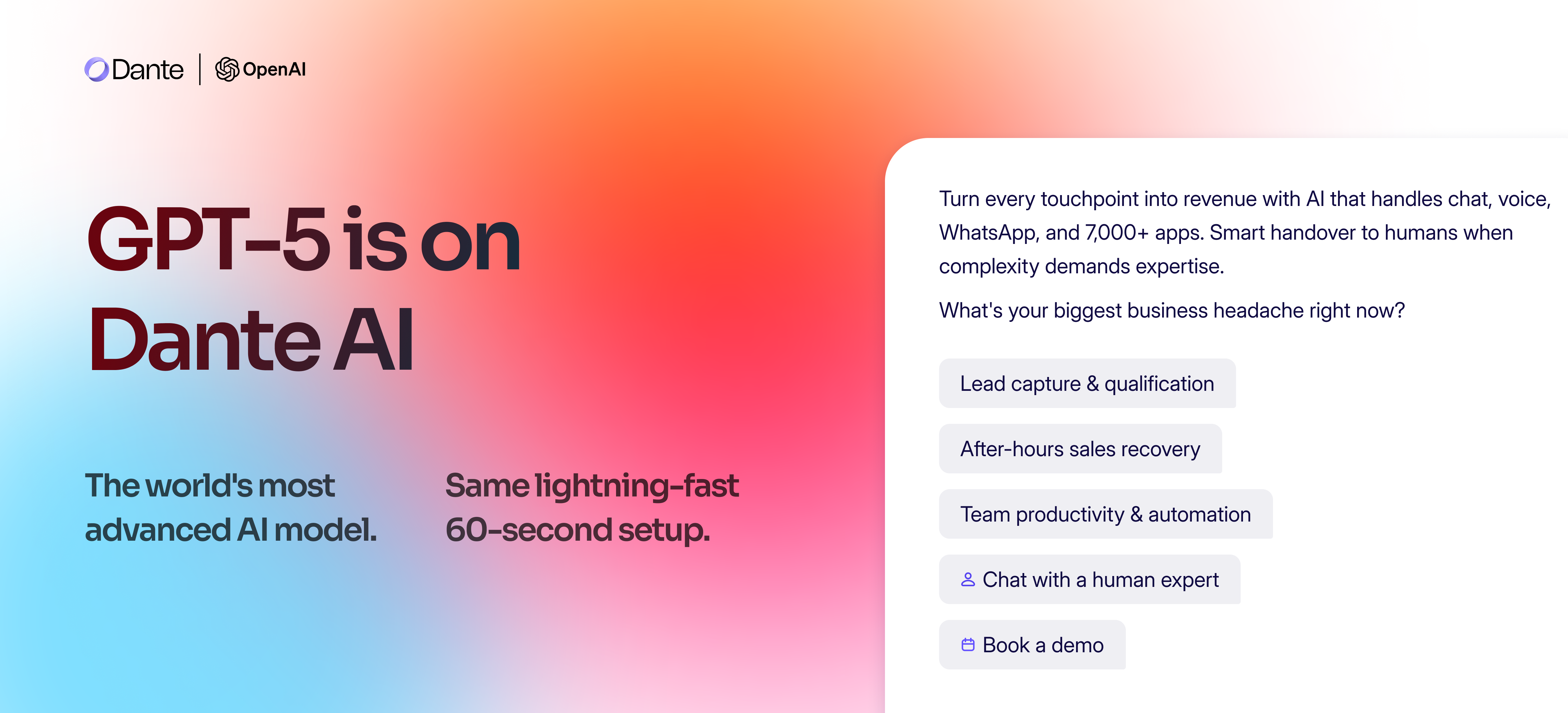 Your chatbots will handle complex questions better, make fewer mistakes, and provide more natural conversations. While other platforms are still working on GPT-5 integration, Dante AI users can deploy GPT-5 chatbots in under 5 minutes.