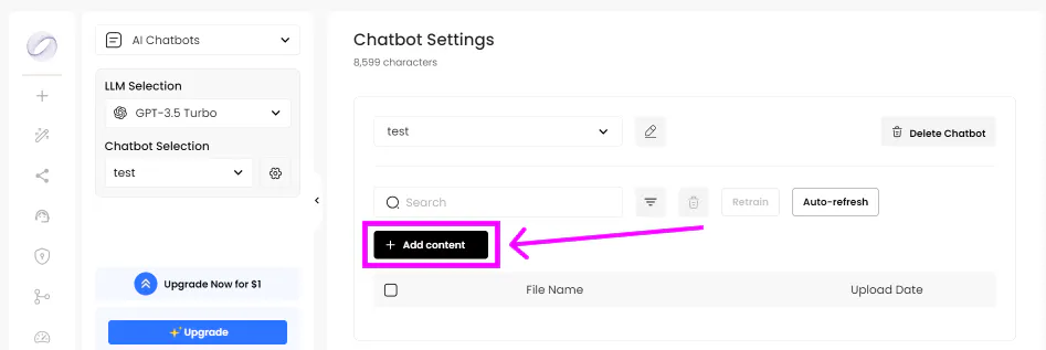 - Upload Documents: Feed these documents into the AI chatbot's training system. For an existing AI chatbot, you can click on the cog icon next to your ‘Chatbot Selection’ on your dashboard, and then upload your documents using the ‘+ Add content’ button.
